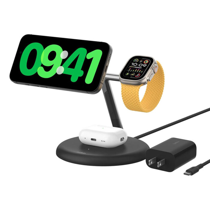 Carga rápida 3 en 1: coloque su teléfono en este soporte para hasta 15 W de carga rápida Qi2 para iPhone más compatibilidad MagSafe, incluso con una funda de hasta 0.118 in encendida. Además, obtén 5 W de carga rápida simultánea para AirPods y Apple Watch Series.
